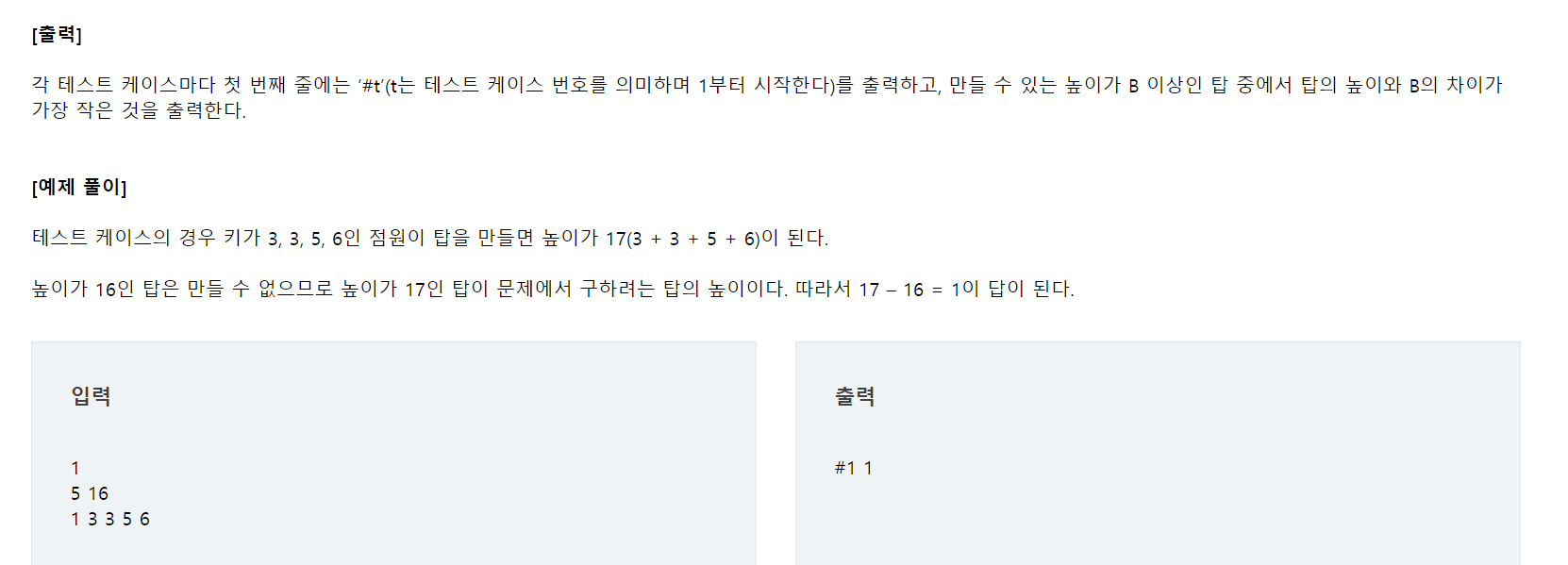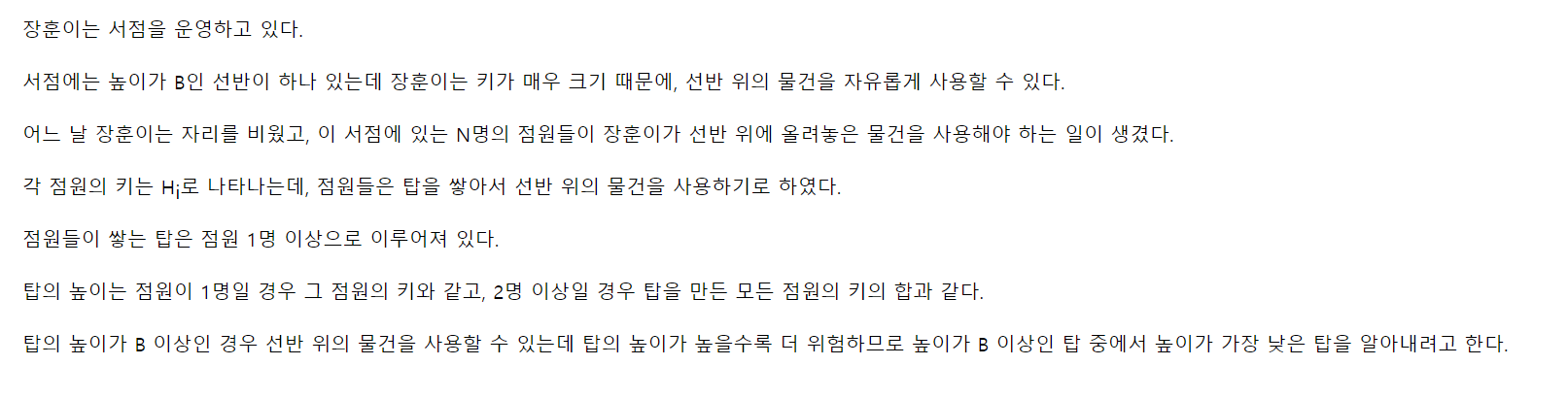 점원의 키를 합쳐서 B 이상의 높이를 만들되, 그 중 가장 낮은 점원 키의 합을 출력하는 문제