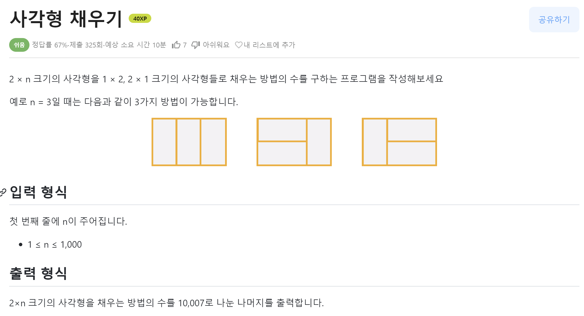 $2*n$의 직사각형을 채울 수 있는 방법의 수에 $100,000,007$으로 나눈 나머지를 출력하시오.