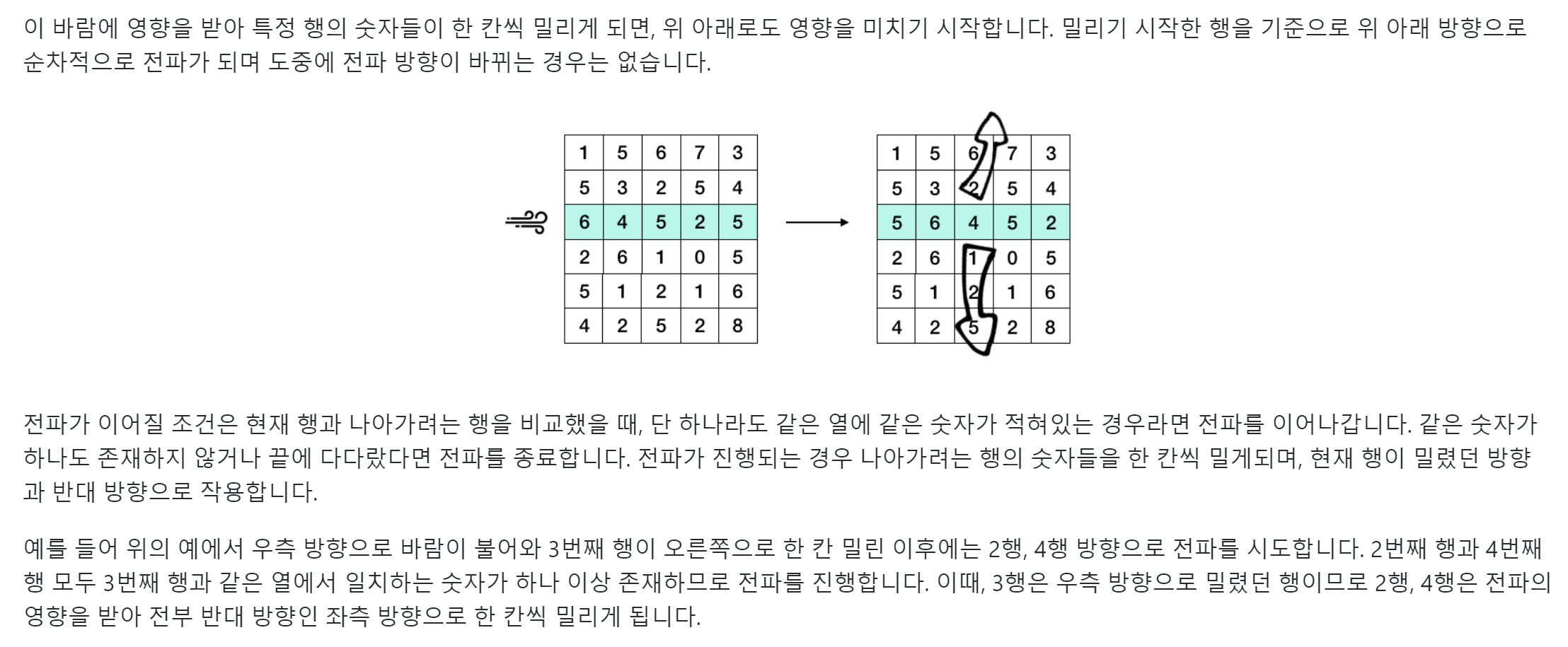 시뮬레이션 문제는 문제가 길어서 겁 먹게 된다,, 이 문제는 1차원 밀어내기 구현이라 어렵지 않았음