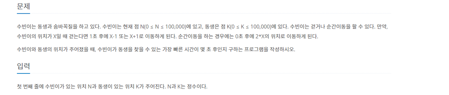 수빈이는 동생과 숨바꼭질을 하고 있다. 수빈이는 현재 점 N(0 ≤ N ≤ 100,000)에 있고, 동생은 점 K(0 ≤ K ≤ 100,000)에 있다. 수빈이는 걷거나 순간이동을 할 수 있다. 만약, 수빈이의 위치가 X일