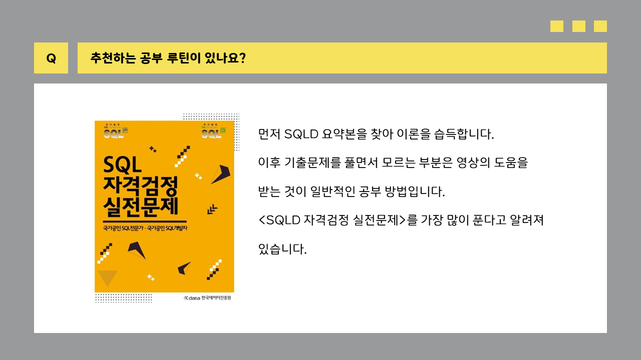 먼저 SQLD 요약본을 찾아 이론을 습득합니다. 이후 기출문제를 풀면서 모르는 부분은 영상의 도움을 받는 것이 일반적인 공부 방법입니다. <SQLD 자격검정 실전문제>를 가장 많이 푼다고 알려져 있습니다.
