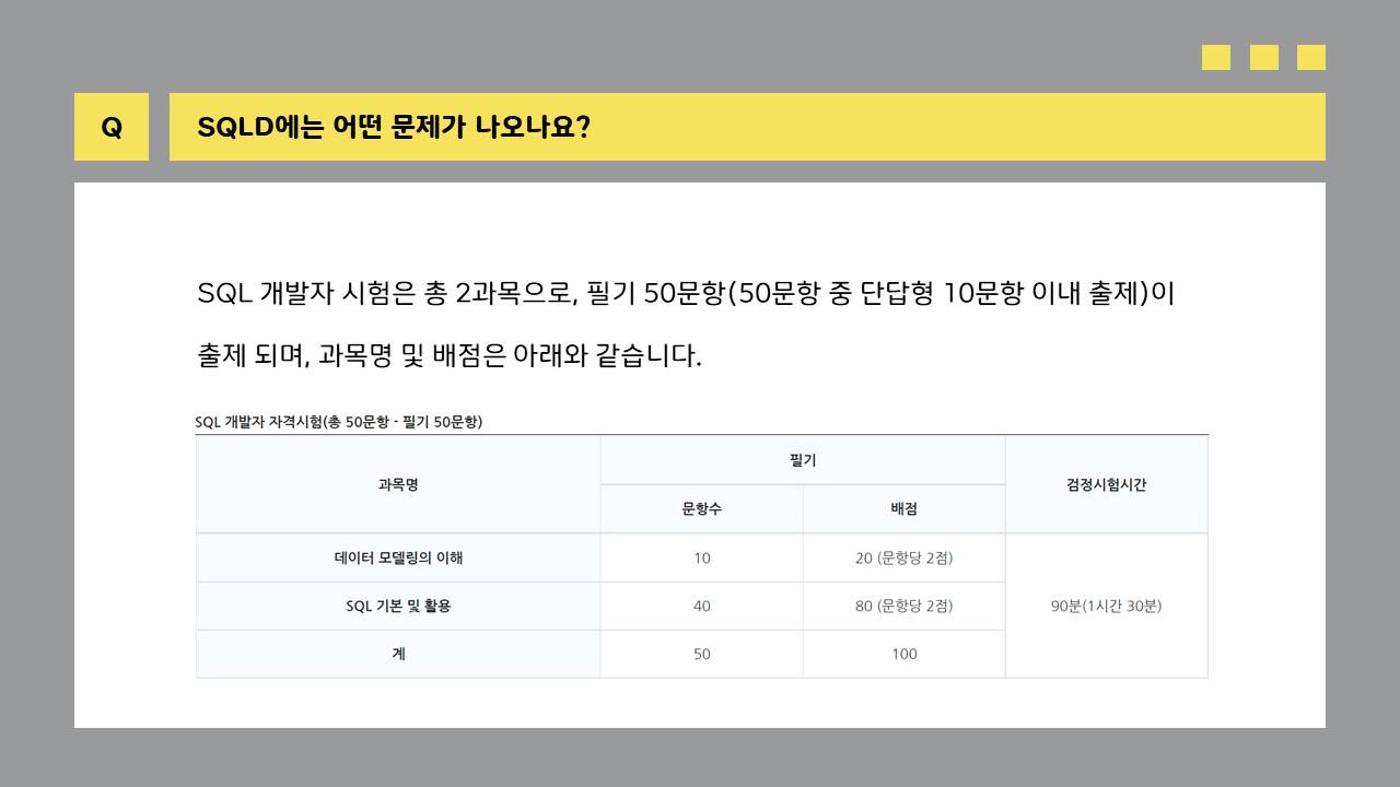 SQL 개발자 시험은 총 2과목으로, 필기 50문항(50문항 중 단답형 10문항 이내 출제)이 출제 되며, 과목명 및 배점은 아래와 같습니다.