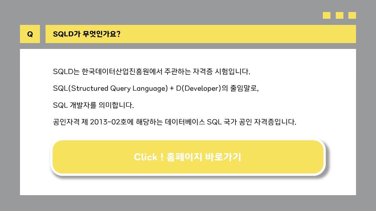 SQLD는 한국데이터산업진흥원에서 주관하는 자격증 시험입니다. SQL(Structured Query Language) + D(Developer)의 줄임말로, SQL 개발자를 의미합니다. 공인자격 제 2013-02호에 해당하는 데이터베이스 SQL 국가 공인 자격증입니다