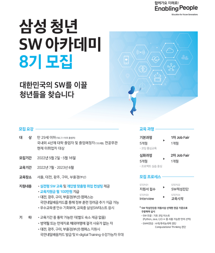 지원서 작성(이름, 생년월일, 성적, 경력, 어학증명 등) ▶ SW적성진단(비전공자 기준: 인적성, CT) / 에세이