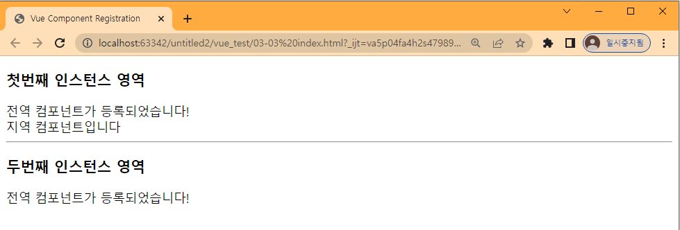 첫번째 영역에서는 전역, 지역 컴포넌트가 모두 정상적으로 나타났지만 구분선 밑 두번째 인스턴스 영역에는 전역 컴포넌트만 나타나고 지역 컴포넌트는 나타나지 않았다.