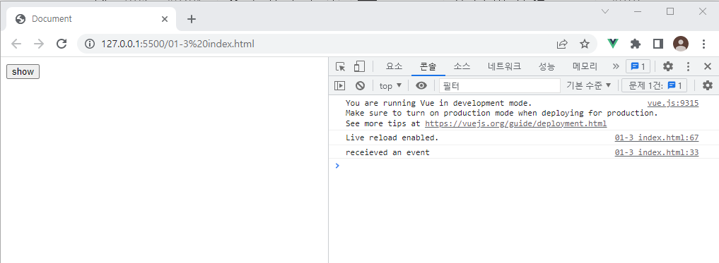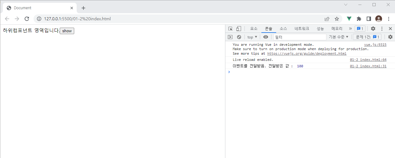 template: '<div>하위컴포넌트 영역입니다.<button v-on:click="showLog">show</button></div>',