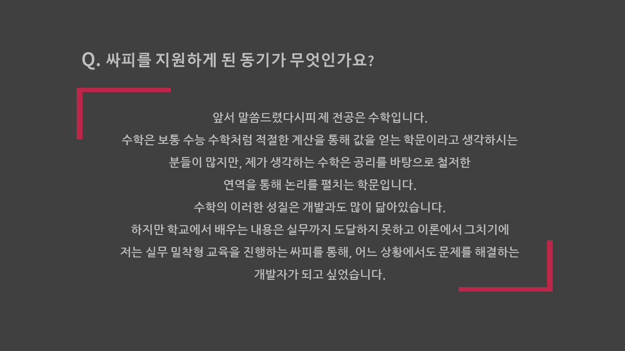 앞서 말씀드렸다시피 제 전공은 수학입니다. 수학은 보통 수능 수학처럼 적절한 계산을 통해 값을 얻는 학문이라고 생각하시는 분들이 많지만, 제가 생각하는 수학은 공리를 바탕으로 철저한 연역을 통해 논리를 펼치는 학문입니다. 수학의 이러한 성질은 개발과도 많이 닮아있습니다. 하지만 학교에서 배우는 내용은 실무까지 도달하지 못하고 이론에서 그치는 경우가 많습니다. 저는 실무 밀착형 교육을 진행하는 싸피를 통해, 어느 상황에서도 문제를 해결하는 개발자가 되고 싶었습니다.