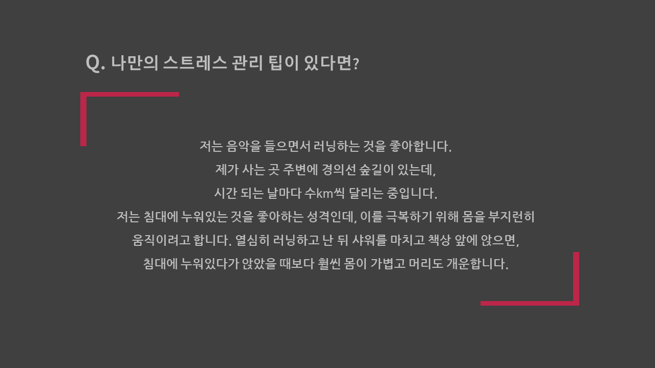 저는 음악을 들으면서 러닝하는 것을 좋아합니다. 제가 사는 곳 주변에 경의선 숲길이 있는데, 시간 되는 날마다 수km씩 달리는 중입니다. 저는 침대에 누워있는 것을 좋아하는 성격인데, 이를 극복하기 위해 몸을 부지런히 움직이려고 합니다. 열심히 러닝하고 난 뒤 샤워를 마치고 책상 앞에 앉으면, 침대에 누워있다가 앉았을 때보다 훨씬 몸이 가볍고 머리도 개운합니다.