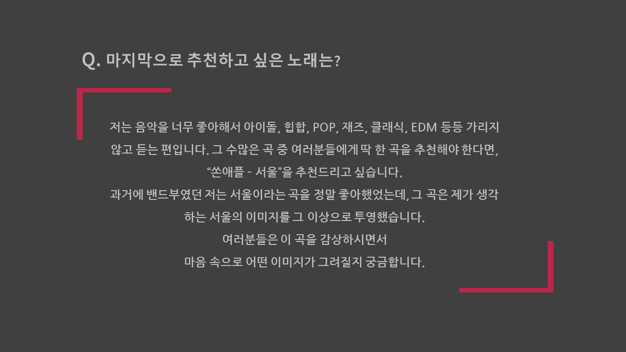 저는 음악을 너무 좋아해서 아이돌, 힙합, POP, 재즈, 클래식, EDM 등등 가리지 않고 듣는 편입니다. 그 수많은 곡 중 여러분들에게 딱 한 곡을 추천해야 한다면, “쏜애플 – 서울”을 추천드리고 싶습니다. 과거에 밴드부였던 저는 서울이라는 곡을 정말 좋아했었는데, 그 곡은 제가 생각하는 서울의 이미지를 그 이상으로 투영했습니다. 여러분들은 이 곡을 감상하시면서 마음 속으로 어떤 이미지가 그려질지 궁금합니다.