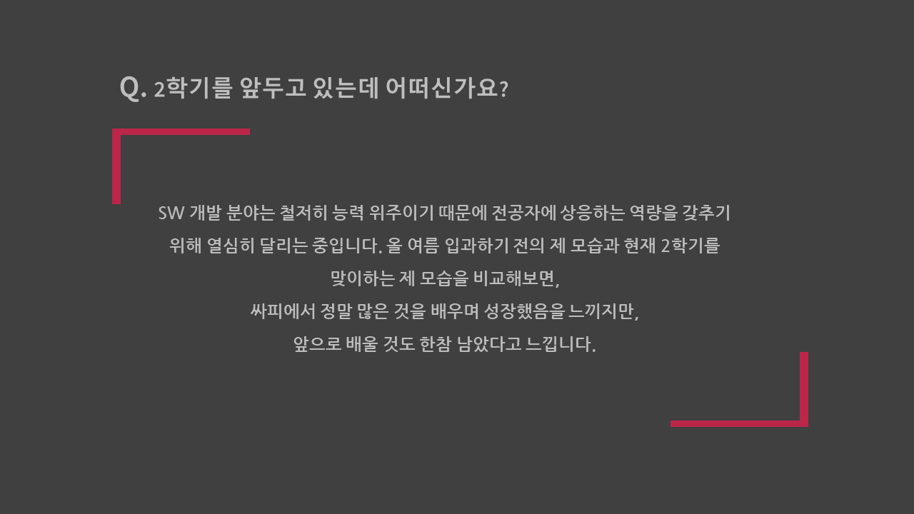 SW 개발 분야는 철저히 능력 위주이기 때문에 전공자에 상응하는 역량을 갖추기 위해 열심히 달리는 중입니다. 올 여름 입과하기 전의 제 모습과 현재 2학기를 맞이하는 제 모습을 비교해보면, 싸피에서 정말 많은 것을 배우며 성장했음을 느끼지만, 앞으로 배울 것도 한참 남았다고 느낍니다.