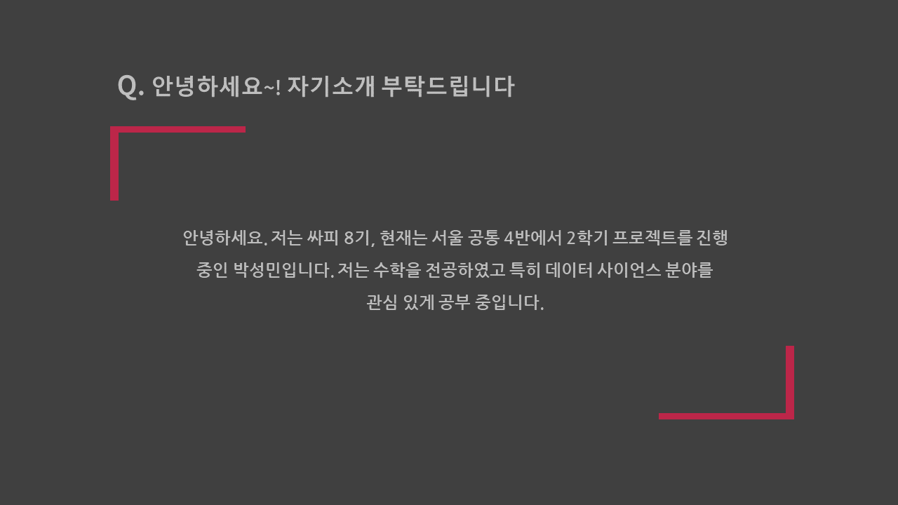안녕하세요. 저는 싸피 8기, 현재는 서울 공통 4반에서 2학기 프로젝트를 진행 중인 박성민입니다. 저는 수학을 전공하였고 특히 데이터 사이언스 분야를 관심 있게 공부 중입니다.
