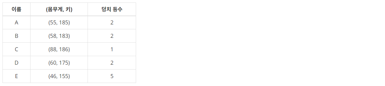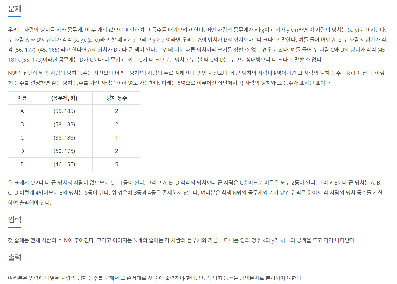 N명의 집단에서 각 사람의 덩치 등수는 자신보다 더 "큰 덩치"의 사람의 수로 정해진다. 만일 자신보다 더 큰 덩치의 사람이 k명이라면 그 사람의 덩치 등수는 k+1이 된다. 이렇게 등수를 결정하면 같은 덩치 등수를 가진 사람은 여러 명도 가능하다. 아래는 5명으로 이루어진 집단에서 각 사람의 덩치와 그 등수가 표시된 표이다.