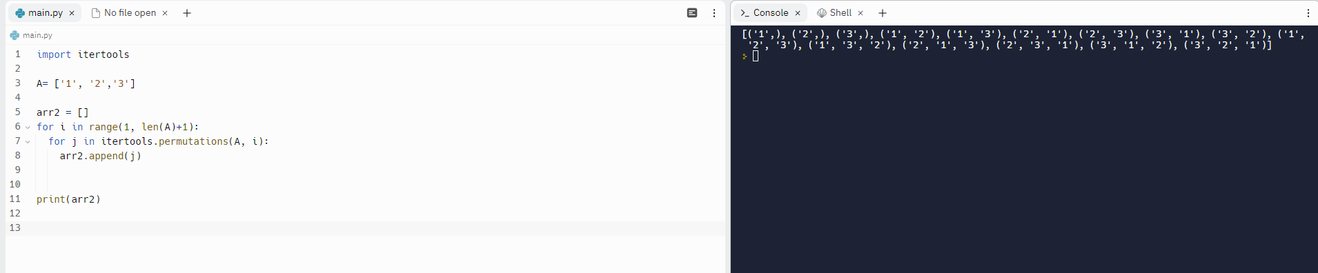 arr = [('1','2'), ('1','3'), ('2','1'), ('2','3'), ('3','1'), ('3','2')]