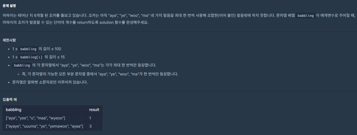 머쓱이는 태어난 지 6개월 된 조카를 돌보고 있습니다. 조카는 아직 "aya", "ye", "woo", "ma" 네 가지 발음을 최대 한 번씩 사용해 조합한(이어 붙인) 발음밖에 하지 못합니다. 문자열 배열 babbling이 매개변수로 주어질 때, 머쓱이의 조카가 발음할 수 있는 단어의 개수를 return하도록 solution 함수를 완성해주세요.
