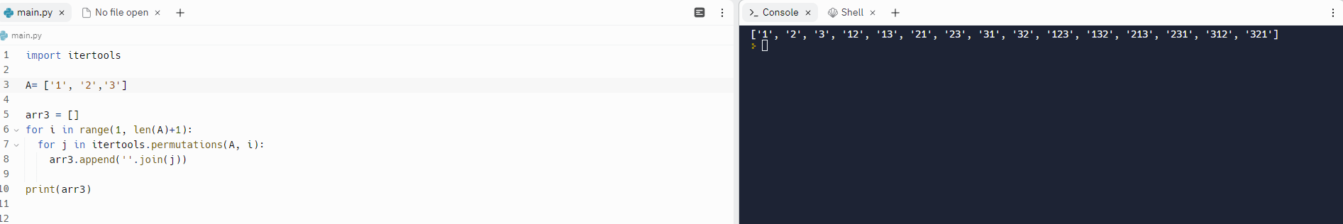 arr = [('1','2'), ('1','3'), ('2','1'), ('2','3'), ('3','1'), ('3','2')]