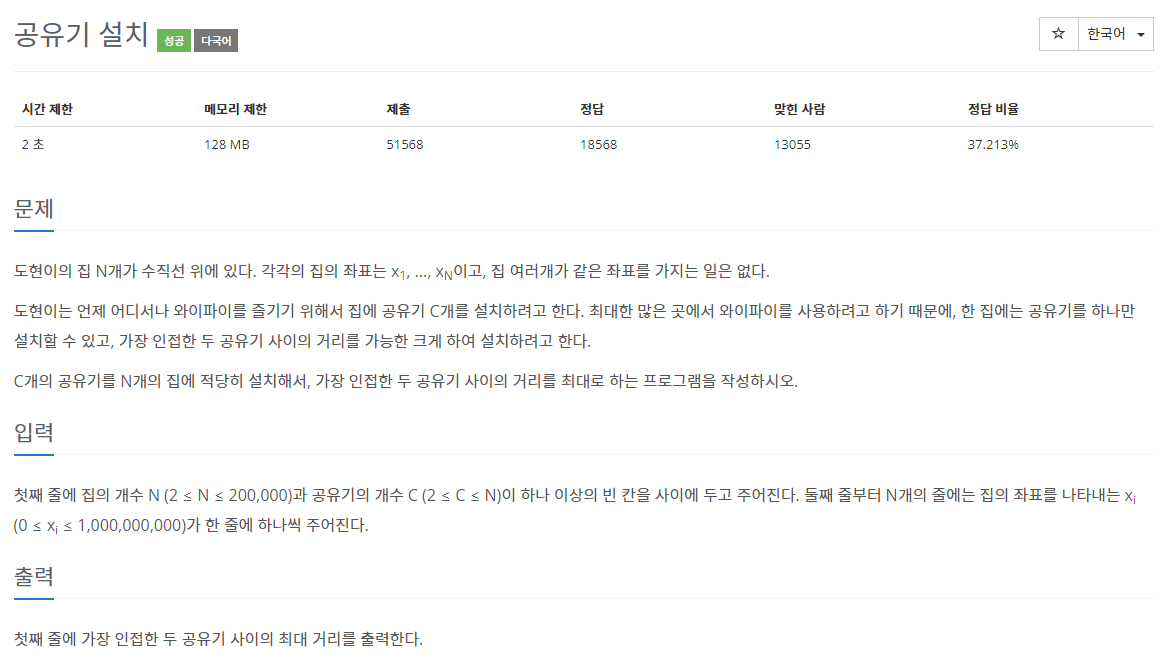 도현이는 언제 어디서나 와이파이를 즐기기 위해서 집에 공유기 C개를 설치하려고 한다. 최대한 많은 곳에서 와이파이를 사용하려고 하기 때문에, 한 집에는 공유기를 하나만 설치할 수 있고, 가장 인접한 두 공유기 사이의 거리를 가능한 크게 하여 설치하려고 한다.