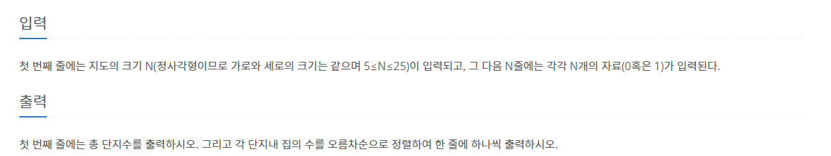 <그림 1>과 같이 정사각형 모양의 지도가 있다. 1은 집이 있는 곳을, 0은 집이 없는 곳을 나타낸다. 철수는 이 지도를 가지고 연결된 집의 모임인 단지를 정의하고, 단지에 번호를 붙이려 한다. 여기서 연결되었다는 것은 어떤 집이 좌우, 혹은 아래위로 다른 집이 있는 경우를 말한다. 대각선상에 집이 있는 경우는 연결된 것이 아니다. <그림 2>는 <그림 1>을 단지별로 번호를 붙인 것이다. 지도를 입력하여 단지수를 출력하고, 각 단지에 속하는 집의 수를 오름차순으로 정렬하여 출력하는 프로그램을 작성하시오.