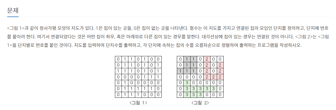 <그림 1>과 같이 정사각형 모양의 지도가 있다. 1은 집이 있는 곳을, 0은 집이 없는 곳을 나타낸다. 철수는 이 지도를 가지고 연결된 집의 모임인 단지를 정의하고, 단지에 번호를 붙이려 한다. 여