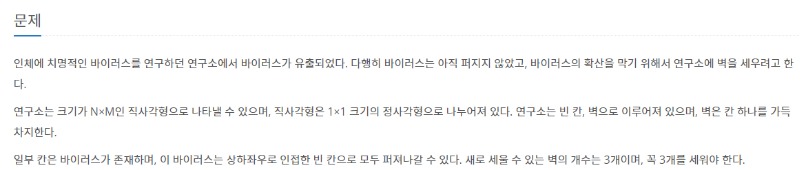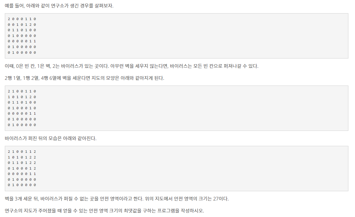 일부 칸은 바이러스가 존재하며, 이 바이러스는 상하좌우로 인접한 빈 칸으로 모두 퍼져나갈 수 있다. 새로 세울 수 있는 벽의 개수는 3개이며, 꼭 3개를 세워야 한다.