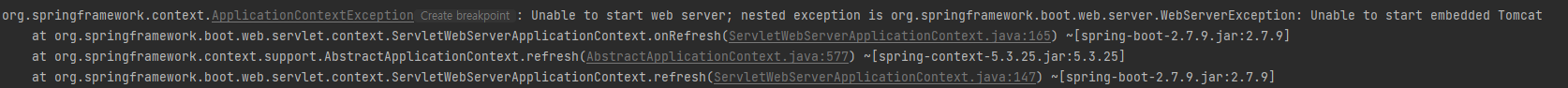 [스프링부트] org.springframework.context.ApplicationContextException: Unable to start web server; nested exception is org.springframework.boot.web.server.WebServerException: Unable to start embedded Tomcat 에러