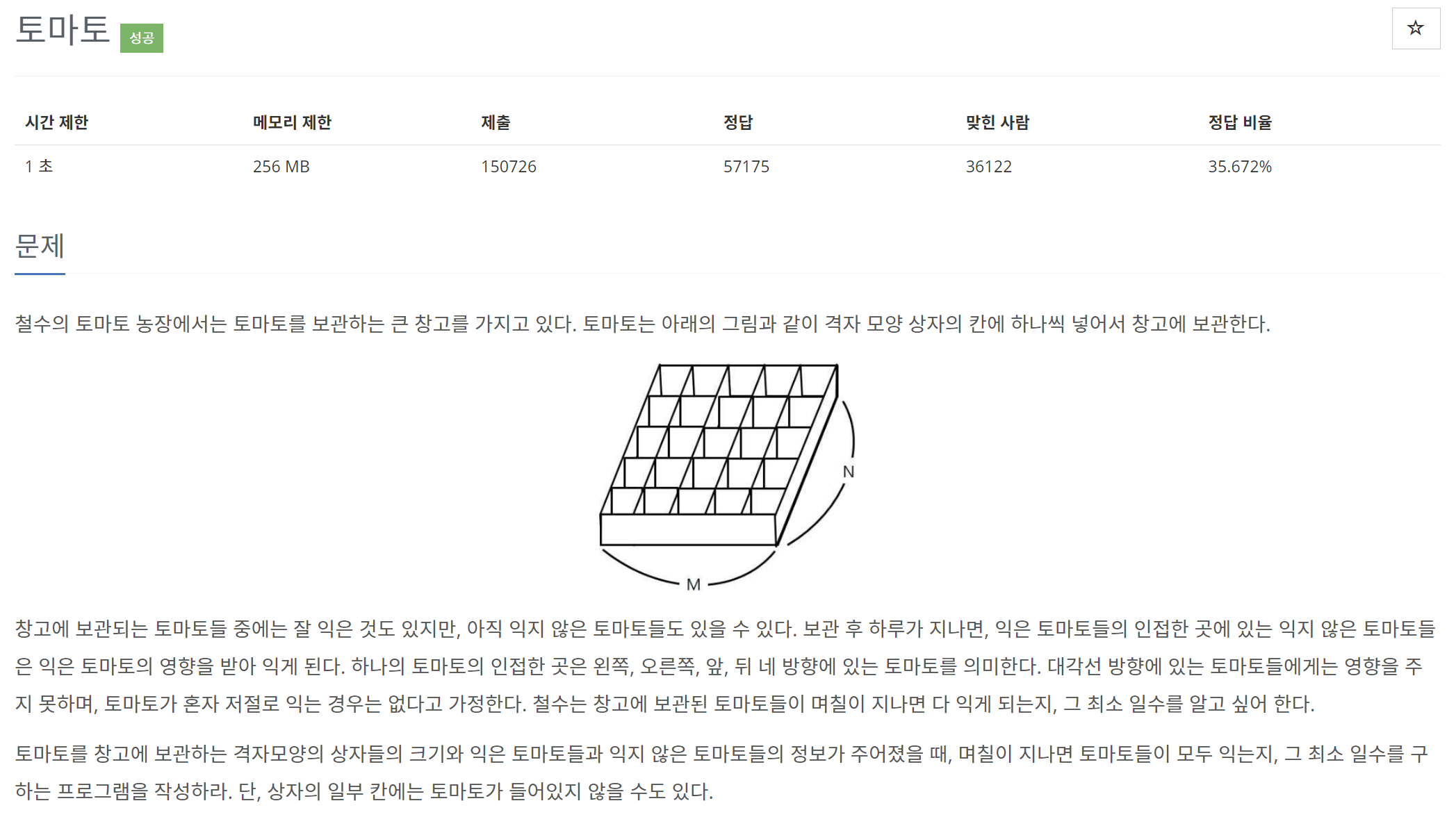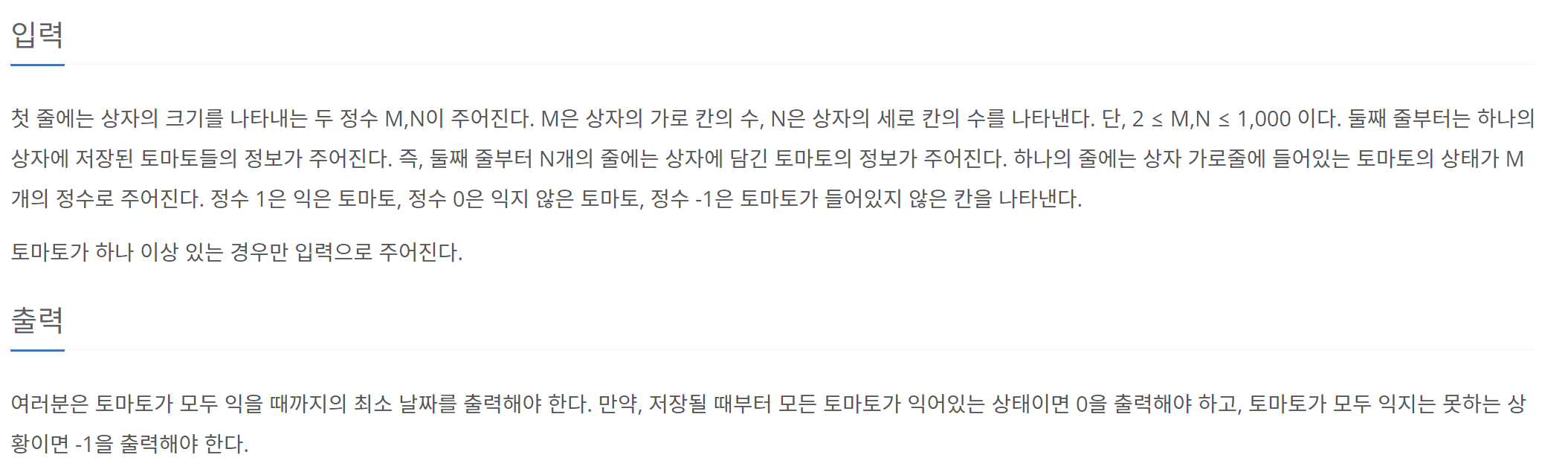 토마토를 창고에 보관하는 격자모양의 상자들의 크기와 익은 토마토들과 익지 않은 토마토들의 정보가 주어졌을 때, 며칠이 지나면 토마토들이 모두 익는지, 그 최소 일수를 구하는 프로그램을 작성하라. 단, 상자의 일부 칸에는 토마토가 들어있지 않을 수도 있다.