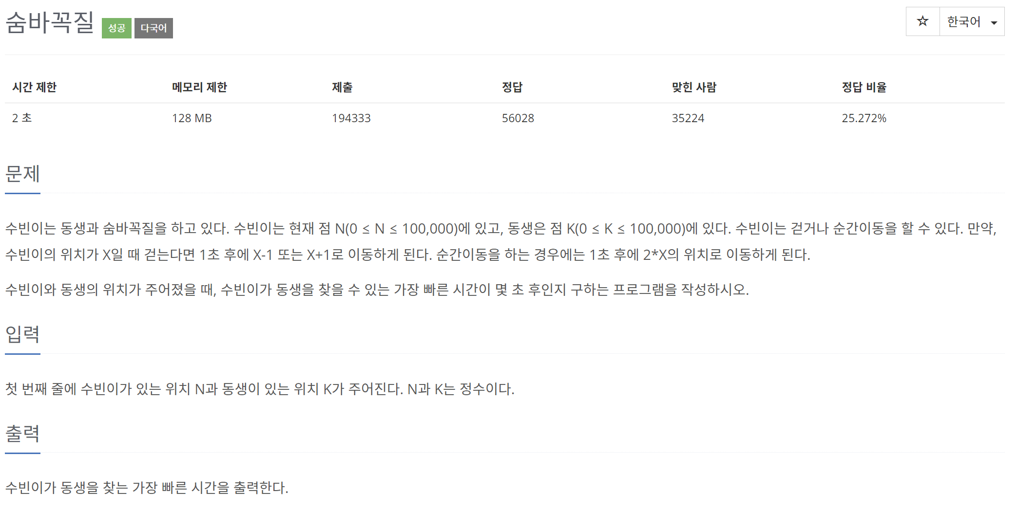 수빈이와 동생의 위치가 주어졌을 때, 수빈이가 동생을 찾을 수 있는 가장 빠른 시간이 몇 초 후인지 구하는 프로그램을 작성하시오.