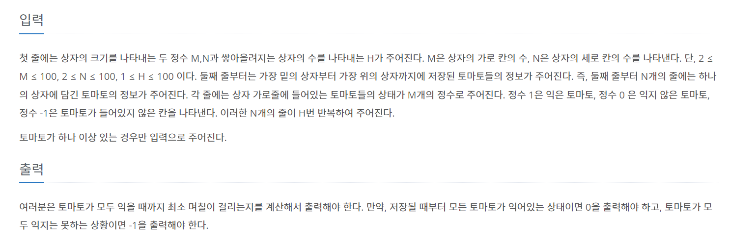 창고에 보관되는 토마토들 중에는 잘 익은 것도 있지만, 아직 익지 않은 토마토들도 있을 수 있다. 보관 후 하루가 지나면, 익은 토마토들의 인접한 곳에 있는 익지 않은 토마토들은 익은 토마토의 영향을 받아 익게 된다. 하나의 토마토에 인접한 곳은 위, 아래, 왼쪽, 오른쪽, 앞, 뒤 여섯 방향에 있는 토마토를 의미한다. 대각선 방향에 있는 토마토들에게는 영향을 주지 못하며, 토마토가 혼자 저절로 익는 경우는 없다고 가정한다. 철수는 창고에 보관된 토마토들이 며칠이 지나면 다 익게 되는지 그 최소 일수를 알고 싶어 한다.