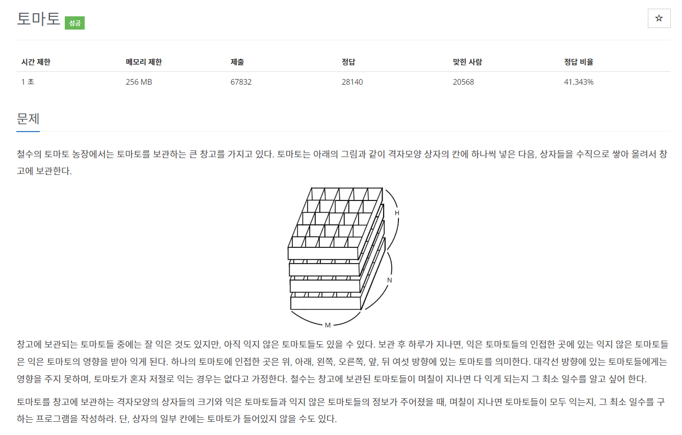 토마토를 창고에 보관하는 격자모양의 상자들의 크기와 익은 토마토들과 익지 않은 토마토들의 정보가 주어졌을 때, 며칠이 지나면 토마토들이 모두 익는지, 그 최소 일수를 구하는 프로그램을 작성하라. 단, 상자의 일부 칸에는 토마토가 들어있지 않을 수도 있다.
