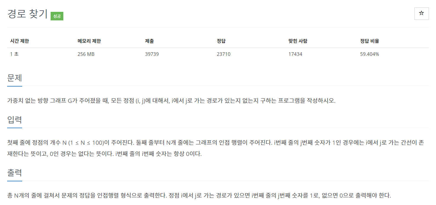 가중치 없는 방향 그래프 G가 주어졌을 때, 모든 정점 (i, j)에 대해서, i에서 j로 가는 경로가 있는지 없는지 구하는 프로그램을 작성하시오.