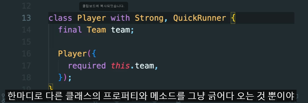 * Mixins의 조건은 생성자가 없는 클래스여야 한다는 것만 기억하기